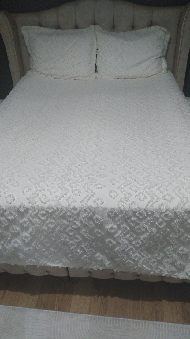 Yatak odanıza yumuşak ve şık bir dokunuş katan, hafif dokulu beyaz parlak yatak örtüsü. ️