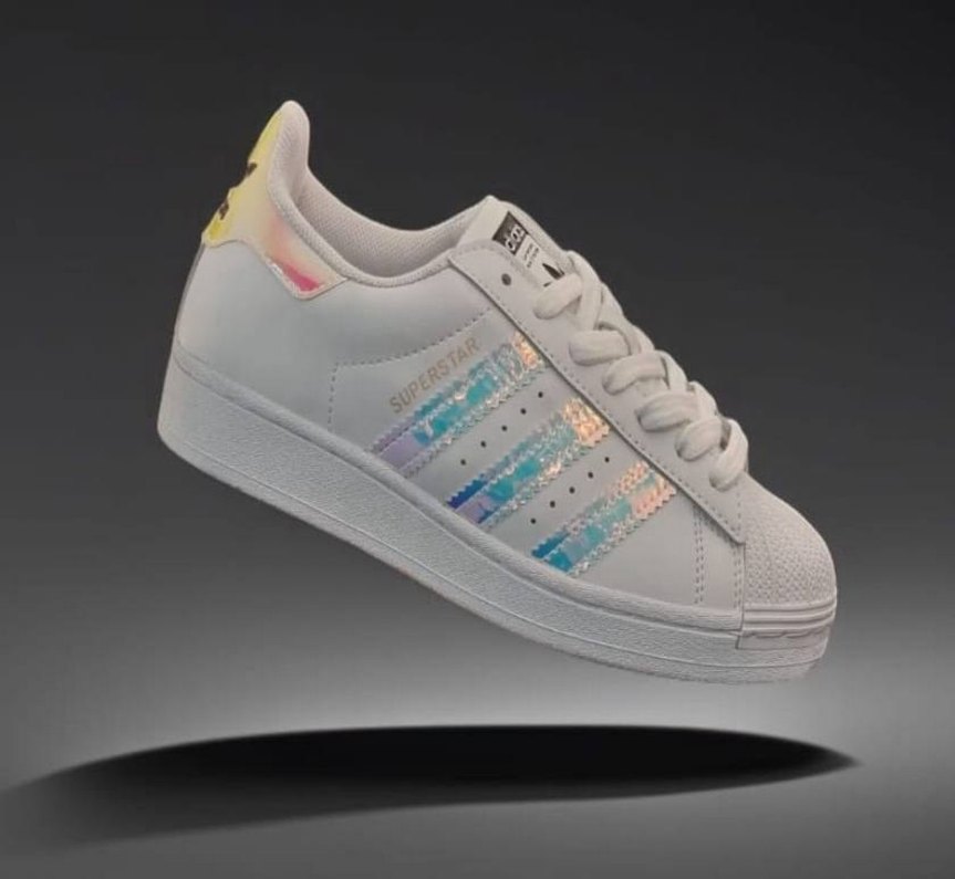 Beyaz, parıltılı detaylara ve yanlarda hafif tie-dye desenine sahip kadın spor ayakkabısı. Kauçuk tabanlı, sokak stili ve athleisure konforunu birleştirir.