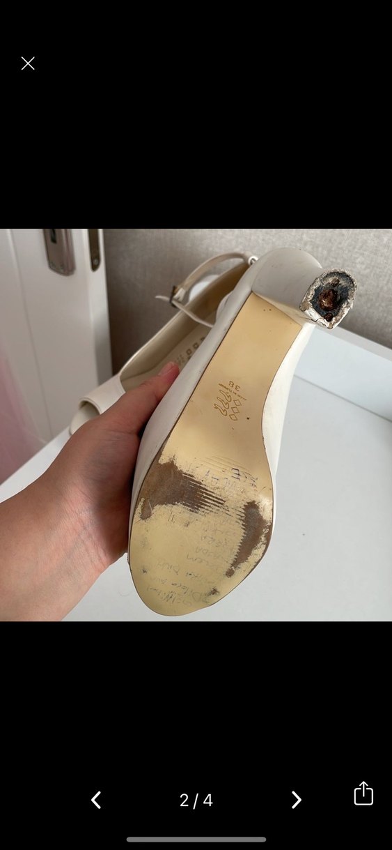 Beyaz, parlak dolgu topuklu kadın ayakkabısı, tokalı kayışlı ve desenli, modern klasik tarzda, düğün için uygun. Bir kez düğünümde giydim topuk kısmında hafif tadilat yaptırırsa yeni alınmış gibi
