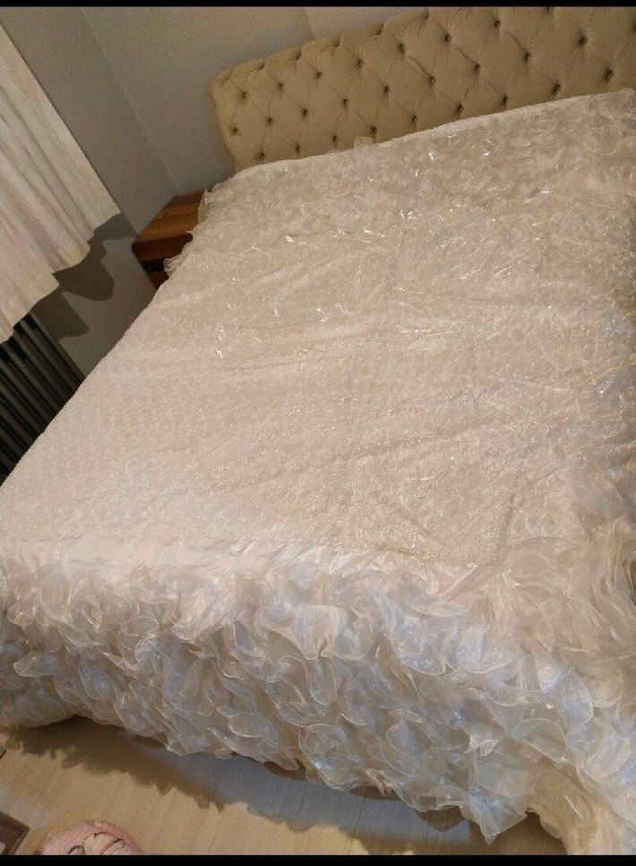 Parlak yüzeye sahip beyaz düz desen yatak örtüsü, şık görünüm için fırfırlı kenarlarla tamamlanmıştır. ️