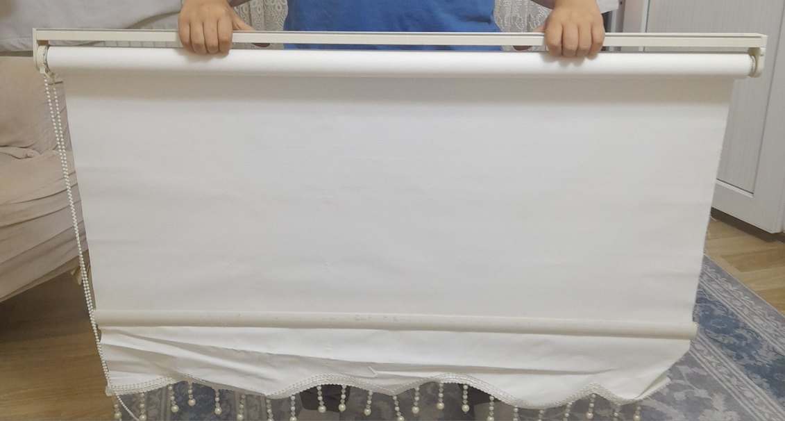 Düz, parlak yüzeye sahip beyaz, klasik tarzda perde. Alt kısmında boncuk detayları bulunur. hiçbir defosu yok. boy.190cm en.101cm