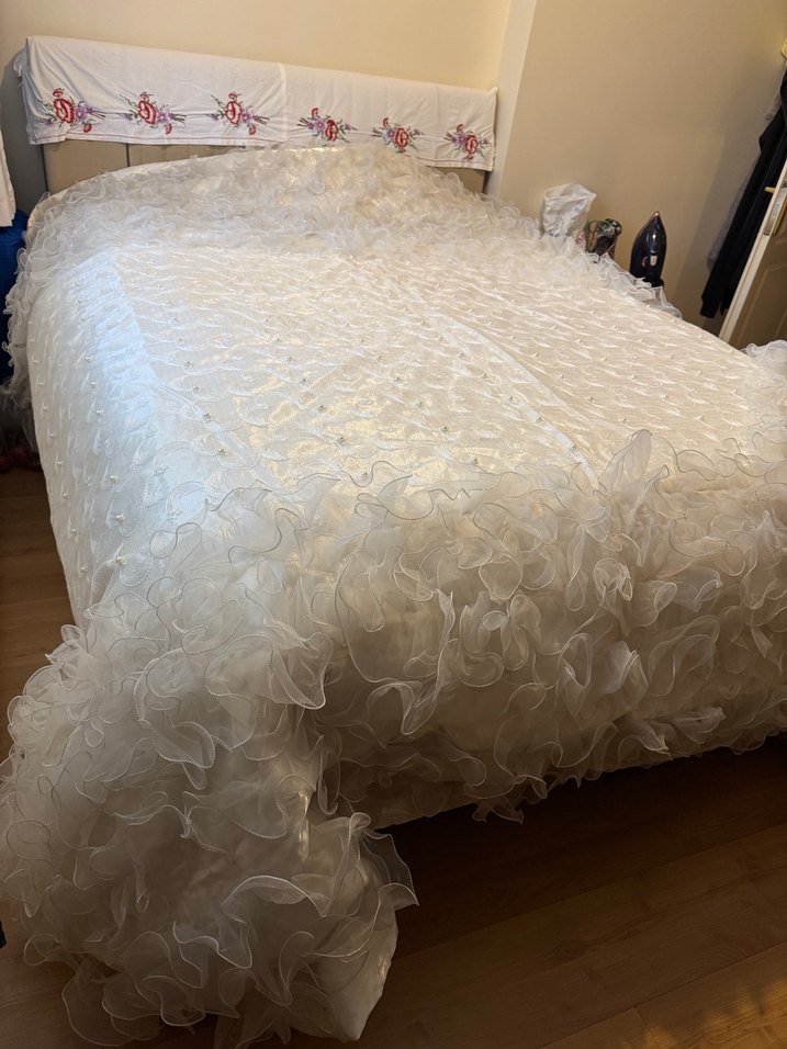 Yumuşak ve zarif dokunuş için uçları fırfırlı, beyaz parlak yatak örtüsü. Pürüzsüz ve parlak bir yüzeye sahiptir. Özel dikimdir.