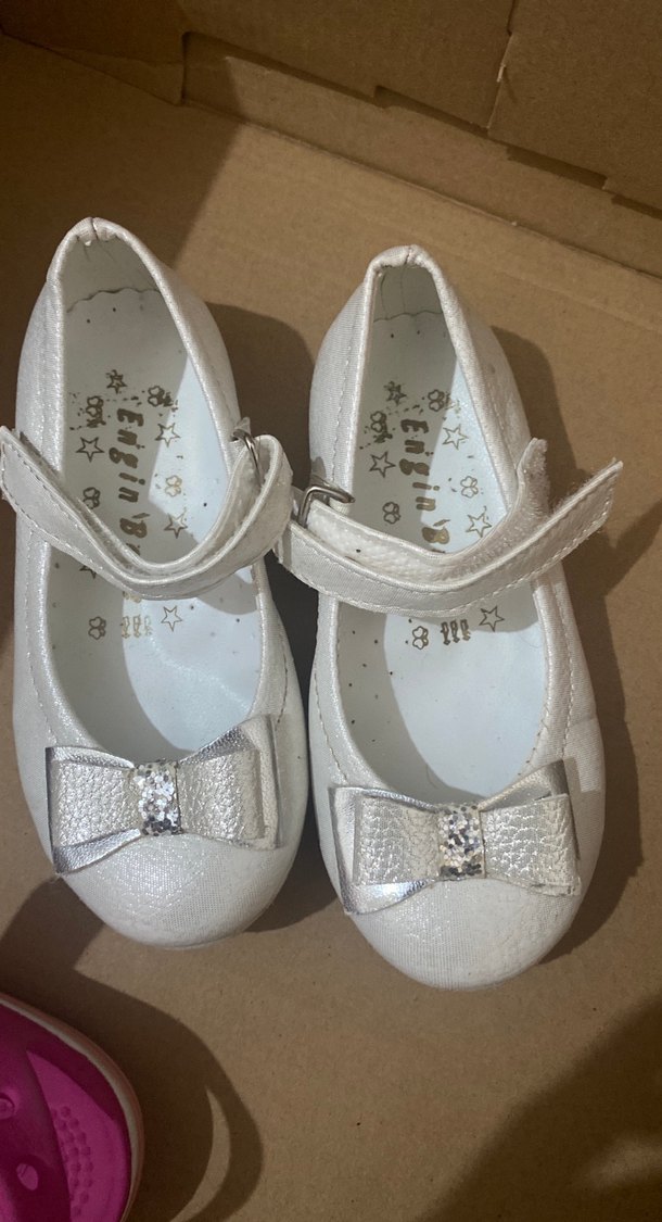 Beyaz parlak yüzeyli, fiyonk detaylı kız babetleri. Kauçuk tabanlı, klasik ve şık görünümlü, bantlı kapanışlı sokak stili ayakkabı.