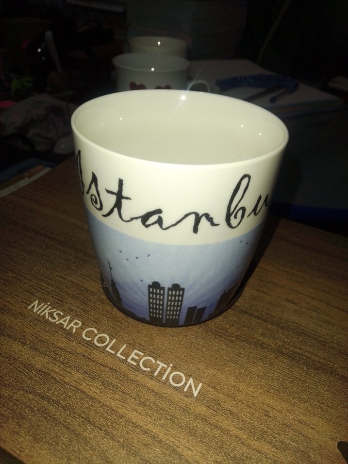 Beyaz ve parlak yüzeye sahip bu kupa, üzerinde 'İstanbul' yazısı ve şehir silueti tasarımı kupa yenidir hiç kullanılmadı problemi yok @kupa @bardak