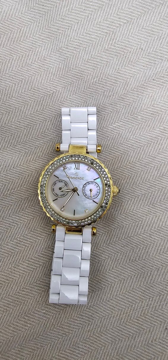 Beyaz kayışlı, parlak payetli çerçeveye sahip modern klasik tasarım kadın kol saati. Altın tonlarında detaylar içerir. ⌚