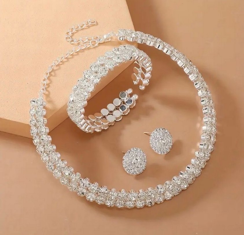 Beyaz parlak taşlarla süslenmiş, modern tasarımlı kolye, bileklik ve küpelerden oluşan kadın takı seti. Düğünler için uygundur.