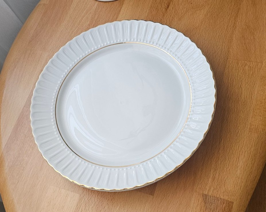 Kütahya porselen 6lı Beyaz parlak yüzeyli, klasik tasarımlı, altın rengi ince kenarlıklı yemek tabağıdır.