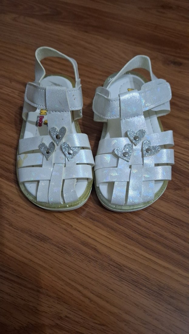 Parlak beyaz kauçuk malzemeden yapılmış, nakışlı kalp detaylı ve tokalı kız çocuk sandaletleri. Bohem tarzı.