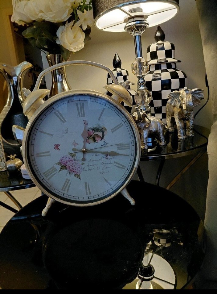 Roman rakamlı, çiçek desenli beyaz parlak masa saati. Klasik yuvarlak tasarıma sahiptir. ⏰
