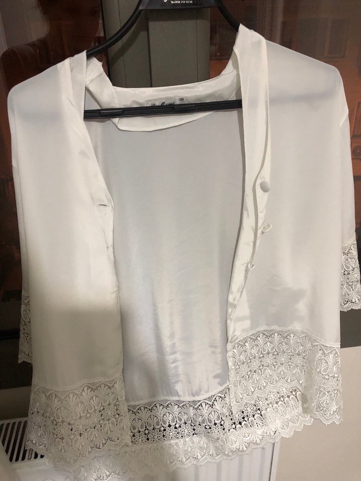 Kısa kollu, bol kesim ve parlak kumaştan yapılmış beyaz midi sabahlık, dantel detaylı etek ucu ile bohem tarzı sunar.