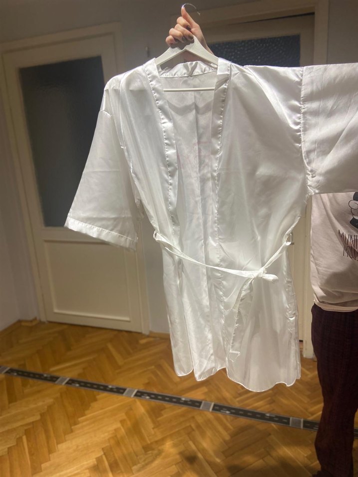 Beyaz, parlak kumaştan yapılmış, kısa kollu ve bol kesim midi boy kadın sabahlık. Minimalist ve bohem tarzda, desensiz tasarıma sahiptir. ✨
