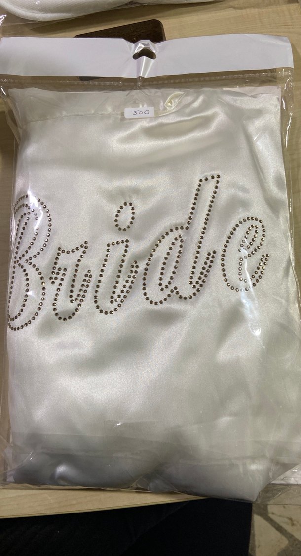 Beyaz renkli, parlak kumaştan, kısa kollu ve bol kesim midi sabahlık. Üzerinde "Bride" yazısı parlak taşlarla süslenmiştir. Minimalist ve bohem tarzda.