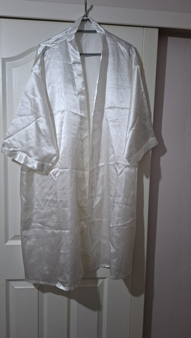 Kadınlar için parlak beyaz kumaştan, kısa kollu ve bol kesim midi uzunluğunda minimalist bohem tarzında deseniz sabahlık. ✨