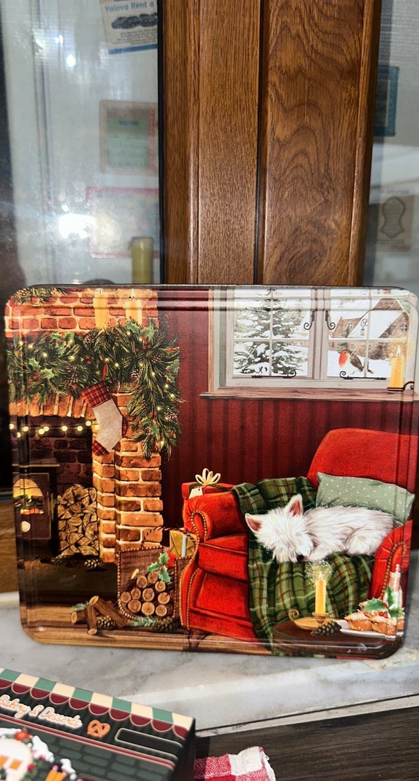 Bu dekoratif tepsi, kırmızı koltukta uyuyan beyaz köpek ve sıcak şömineyle Noel temalı rahat bir sahne sunar. Beyaz parlak zemin ve şık detaylar içerir. İngiltereden geldi