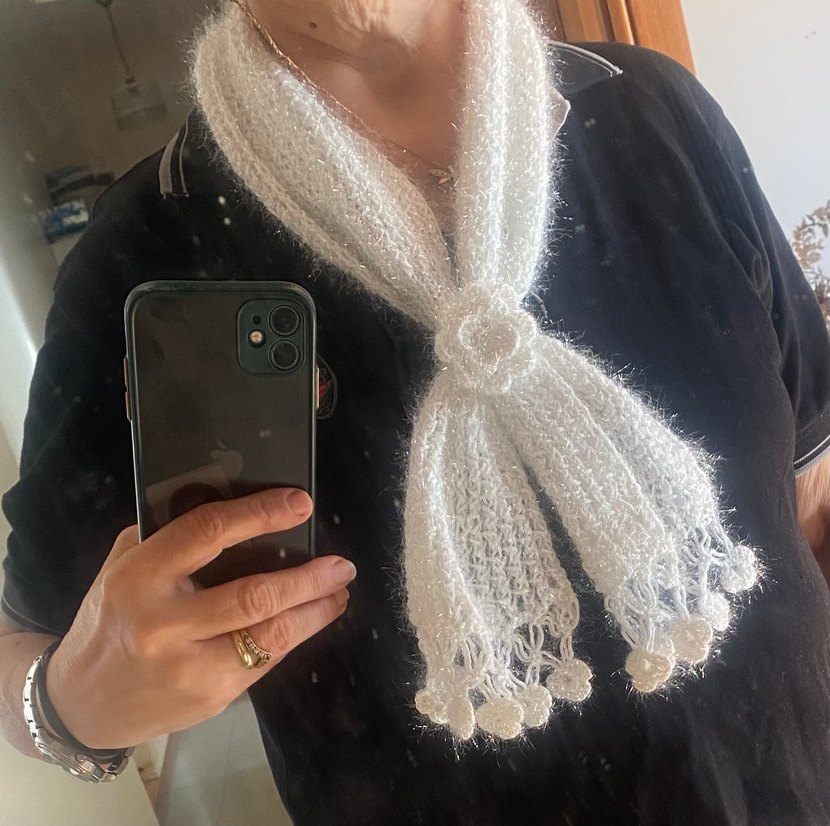 Yumuşak örgü beyaz şal, parlak dokunuşlu, örgülü detaylar ve ponponlu püsküllerle. Rahat ve bohem stil için uygun. ❄️ gri rengi de bulunmaktadır
