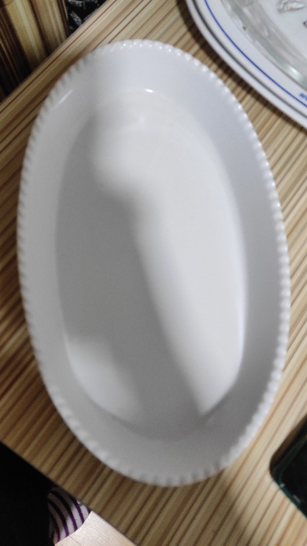 Parlak beyaz renkte, kenarı desenli oval tabak, yemek servisi için uygundur. ️