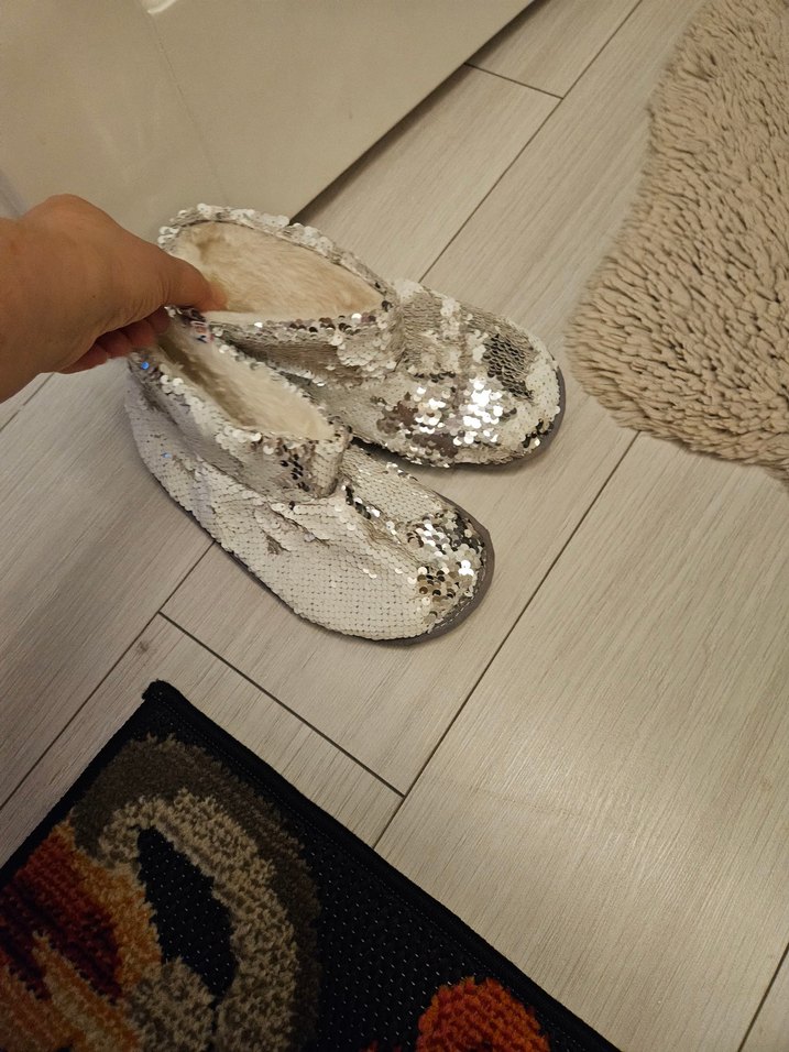 Beyaz payetli terlik, parlak yılan desenli ve rahat kauçuk malzemeden üretilmiştir.
