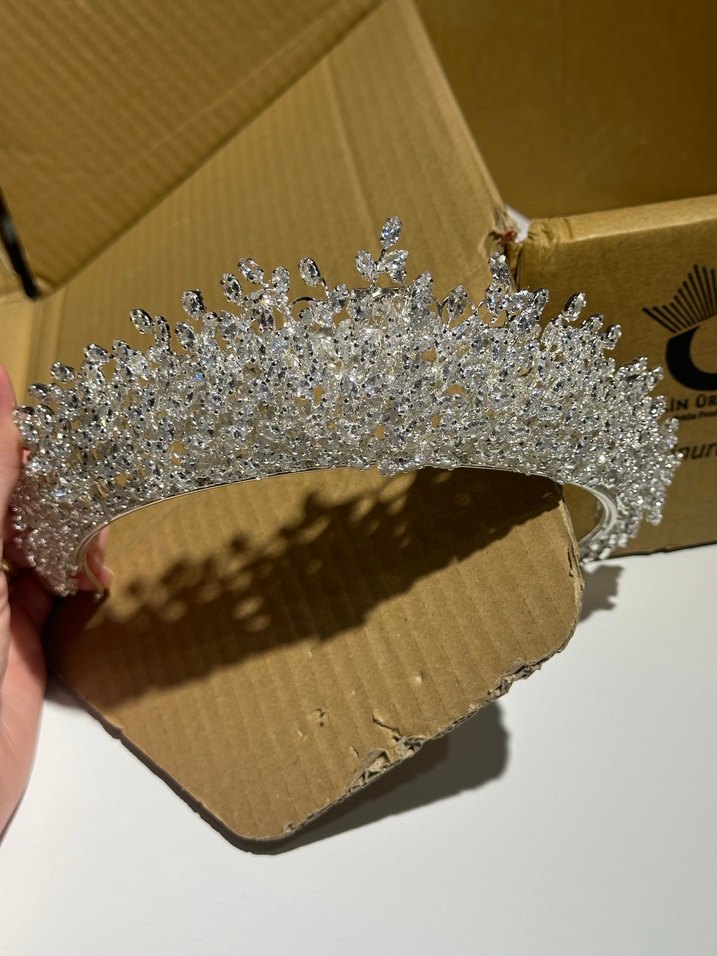 Beyaz payetli ve parlak tasarıma sahip, klasik tarzda gelin tacı. ✨