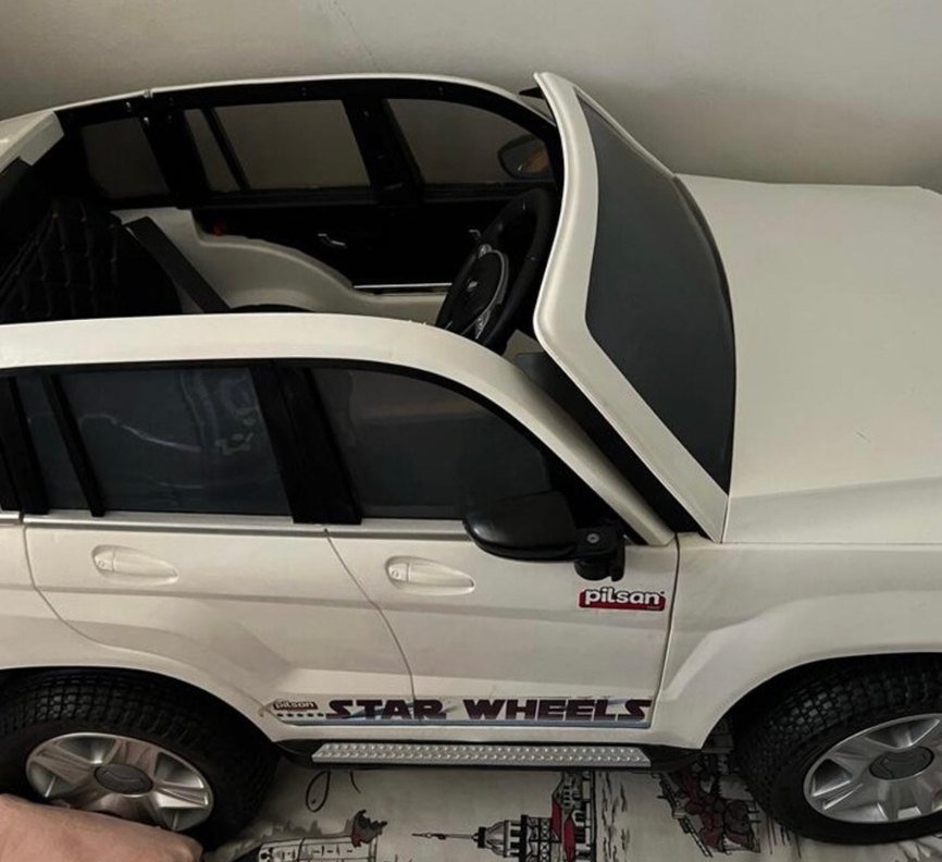 Beyaz parlak Pilsan elektrikli binici araba, detaylı kapılar ve gerçekçi tasarıma sahiptir.