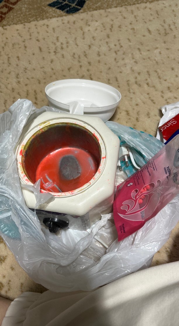 Parlak beyaz plastikten yapılmış, çıkarılabilir kapağa sahip ağda makınesı aleti. İç kısmı kullanılmış ve yanında ek ürünler plastik poşette bulunuyor.