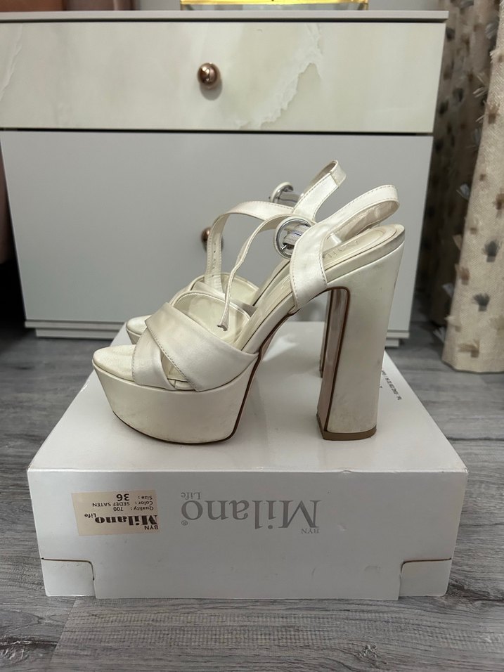Beyaz, parlak ve ipeksi malzemeden platform topuklu, tokalı kayışlı kadın abiye ayakkabı. Düğün ve klasik zarafet için çağdaş tarzda, desenli detaylı. Bir düğünde bir de dış çekimde giydim, defosu falan yok sadece hafif lekeleri mevcut. Boyu 14 cm
