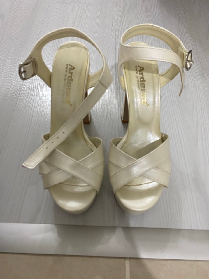 Beyaz parlak platform topuklu, tokalı kadın abiye ayakkabı, minimalist ve klasik şıklık için uygundur.