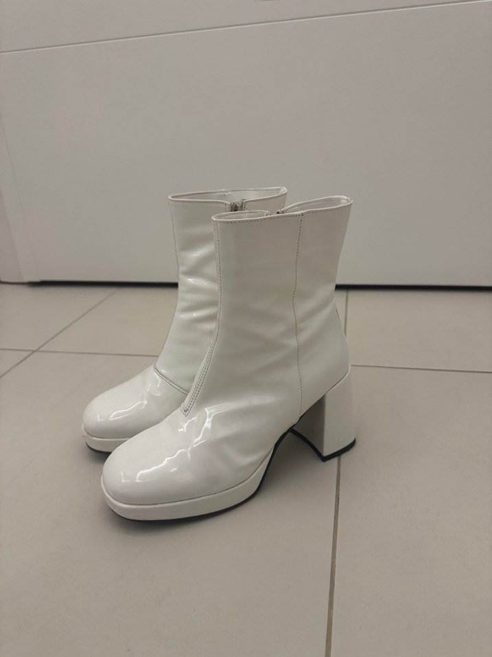 Beyaz parlak yüzeye sahip, düz platform topuklu, minimalist tarzda kadın botları. Günlük kullanıma uygun, şık ve modern tasarım.
