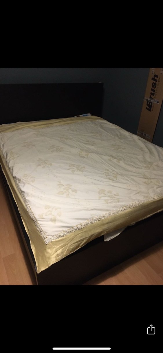 Parlak beyaz renkte, sade tasarımlı yatak örtüsü, kenarlarında hafif çiçek detayları bulunur. ️ ölçü fotoda birkaç yerinde yırtığı olan saten kısmının bir kenarında da hafif tüylenme var