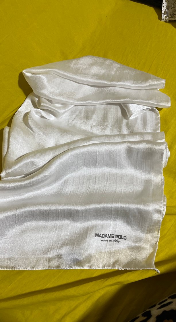 Bu beyaz kadın şal, parlak ve saten dokusuyla drapeli bir tasarıma sahiptir. MADAMEPOLO etiketiyle minimalist ve bohem tarz sunar.