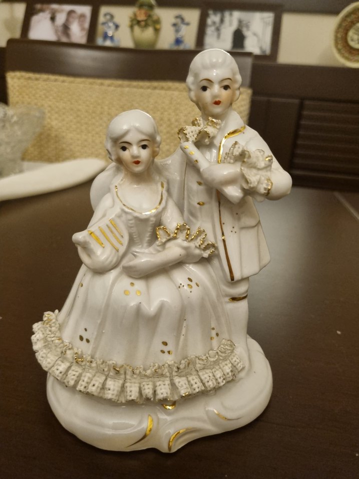 Parlak beyaz seramikten yapılmış, altın detaylı ve dantel görünümlü süslemeli vintage kıyafetli bir adam ve kadını tasvir eden figürin.
