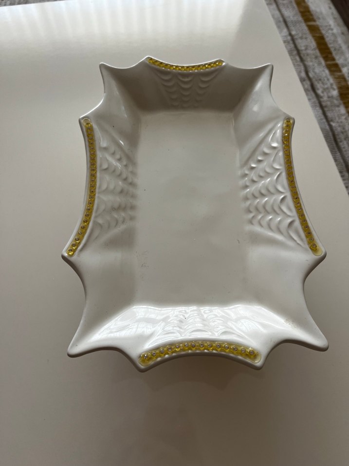 Kenarlarında altın detaylar ve hafif kabartmalı desenler bulunan, beyaz parlak seramik kayık tabak. Geleneksel tarzda ve desensiz.