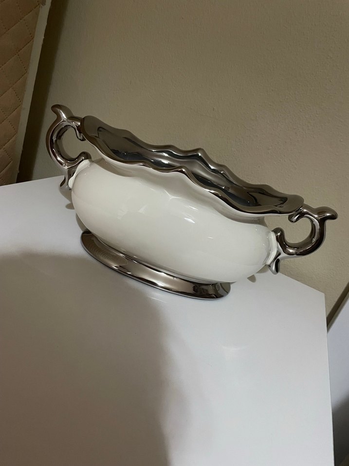 Parlak yüzeyli beyaz vazo, metalik saplarla birlikte dalgalı şık tasarıma sahip. Dekoratif kullanım için uygundur.