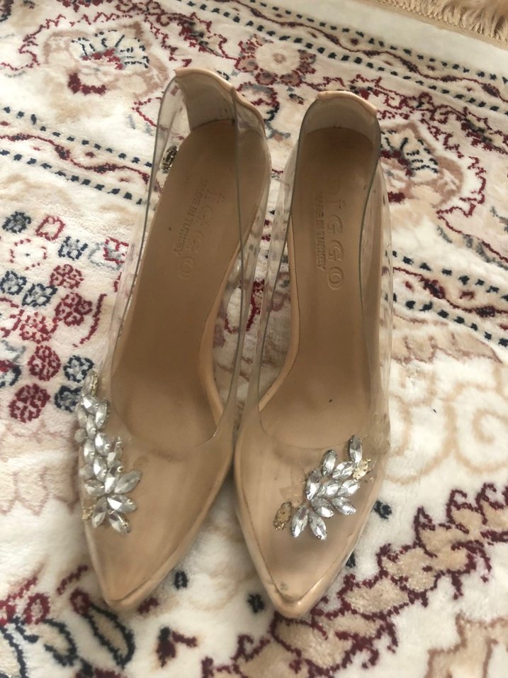 Beyaz renkte, parlak ve taşlı detaylara sahip stiletto topuklu abiye ayakkabı. Lastik malzemeden yapılmıştır, düğünler için uygundur.