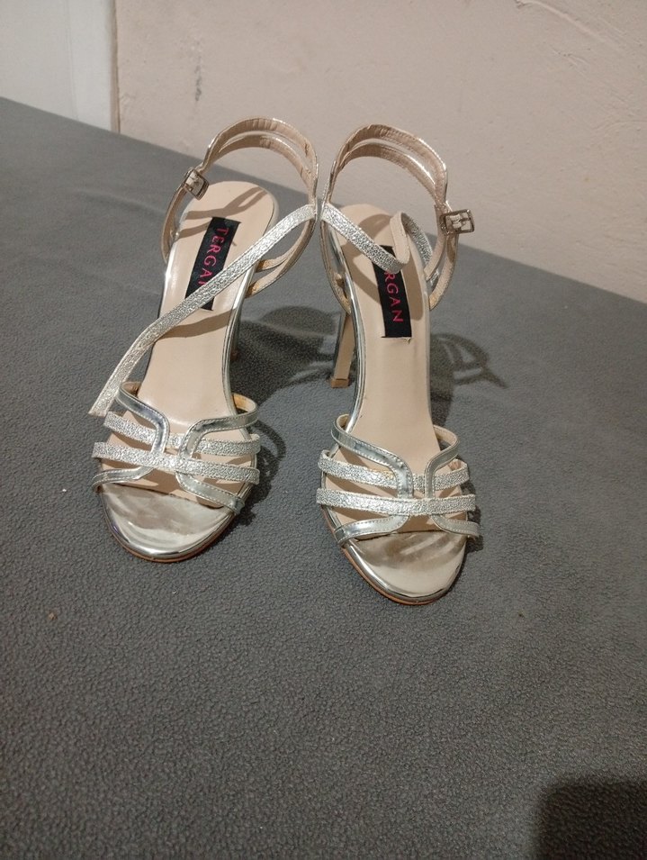 Beyaz parlak stiletto topuklu, tokalı kayışlara sahip, kauçuk malzemeden yapılmış, düğün ve özel günler için uygun şık bir ayakkabıdır.