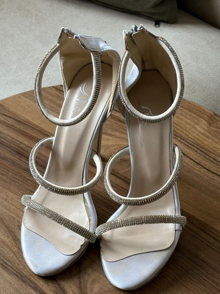 İpek gibi beyaz parlak malzemeden, tokalı kayışlı ve stiletto topuklu abiye kadın ayakkabısı. Düğün ve özel anlar için uygundur. Modern ve desensiz tasarım.