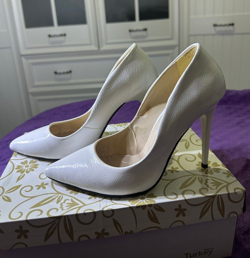 Beyaz parlak stiletto topuklu ayakkabılar, yılan derisi desenli ve dantel detaylı, kauçuk malzemeden. Düğünler için modern klasik tarzda.