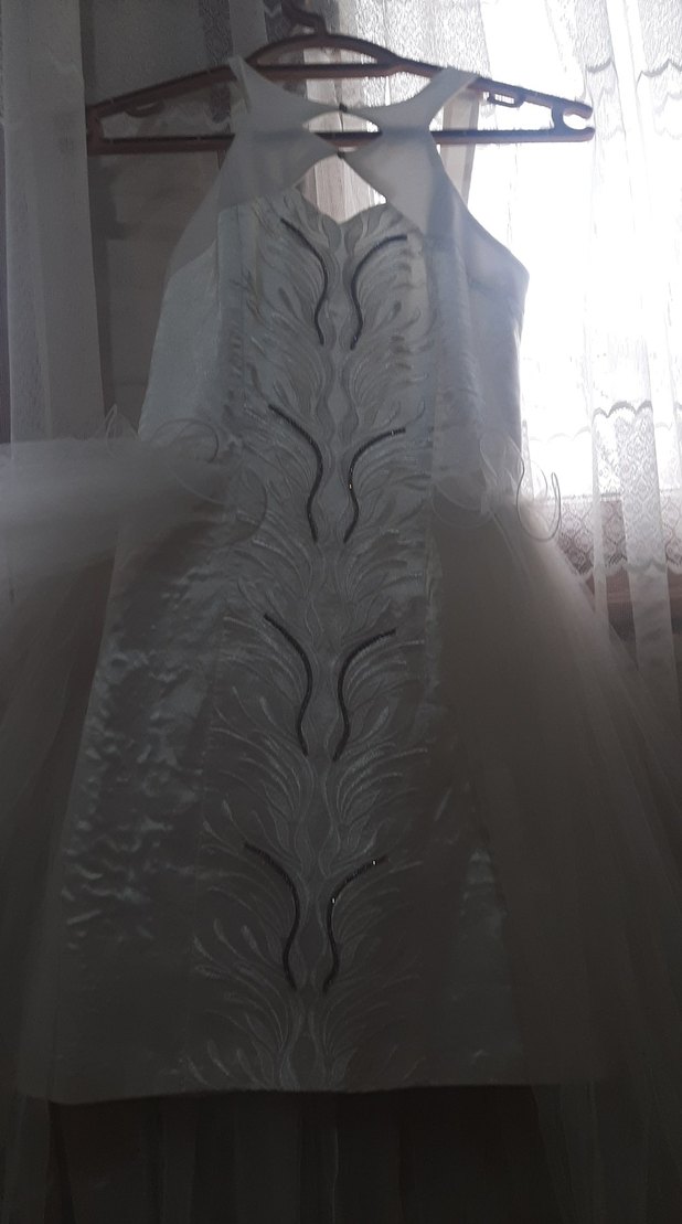 Bu beyaz parlak A-line gelinlik, straplez yaka ve askılı kollara sahip. Önünde avangart dokulu detaylar bulunuyor, uzun ve vücuda oturan kesimdedir. Fiat konusunda pazarlık olur teklif attin