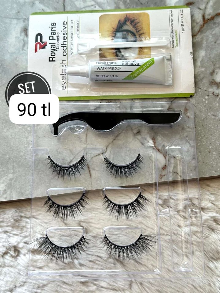 Üç çift beyaz parlak takma kirpik, suya dayanıklı şeffaf yapıştırıcı ve uygulama aparatı içeren set.