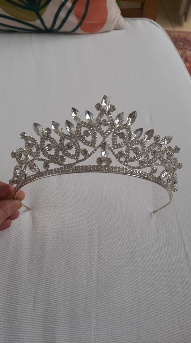Beyaz ve parlak taşlı, simli detaylara sahip gelin tacı. Klasik ve gösterişli tarzıyla zamansız bir şıklık sunar. sıfır ürün