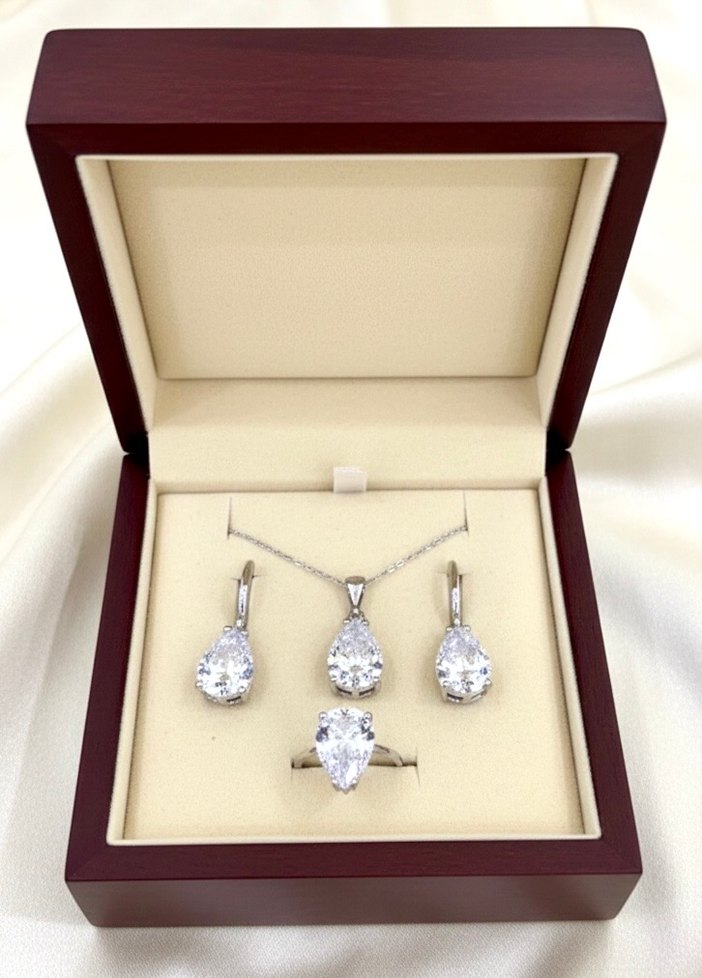 Bu kadın takı seti, büyük, berrak damla şeklinde taşlar içeren kolye, küpe ve yüzükten oluşur. Modern klasik tarzda, beyaz parlak taşlı, düğün için uygun.