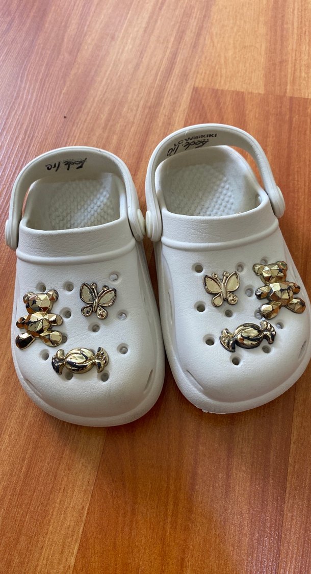 Beyaz kauçuk kız çocuk terliği, parlak taşlı ayıcık, kelebek ve şeker süslemeleriyle bohem tarzda sokak giyimine uygun.