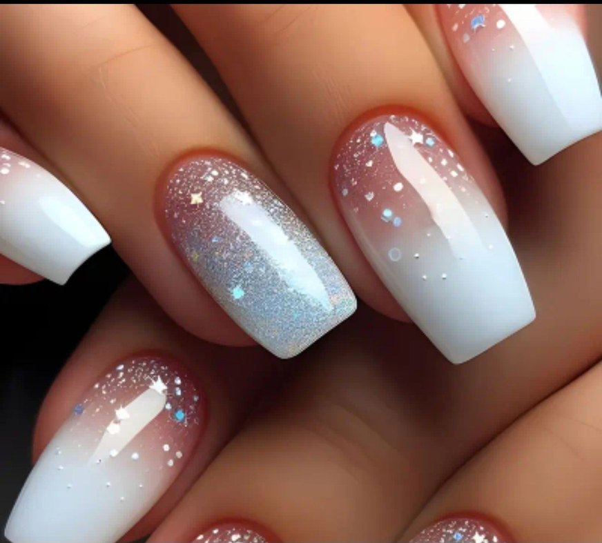 Beyaz, parlak sim ve küçük yıldız detaylarıyla tırnak süslemeleri. Hafif ve zarif görünüm sağlar.