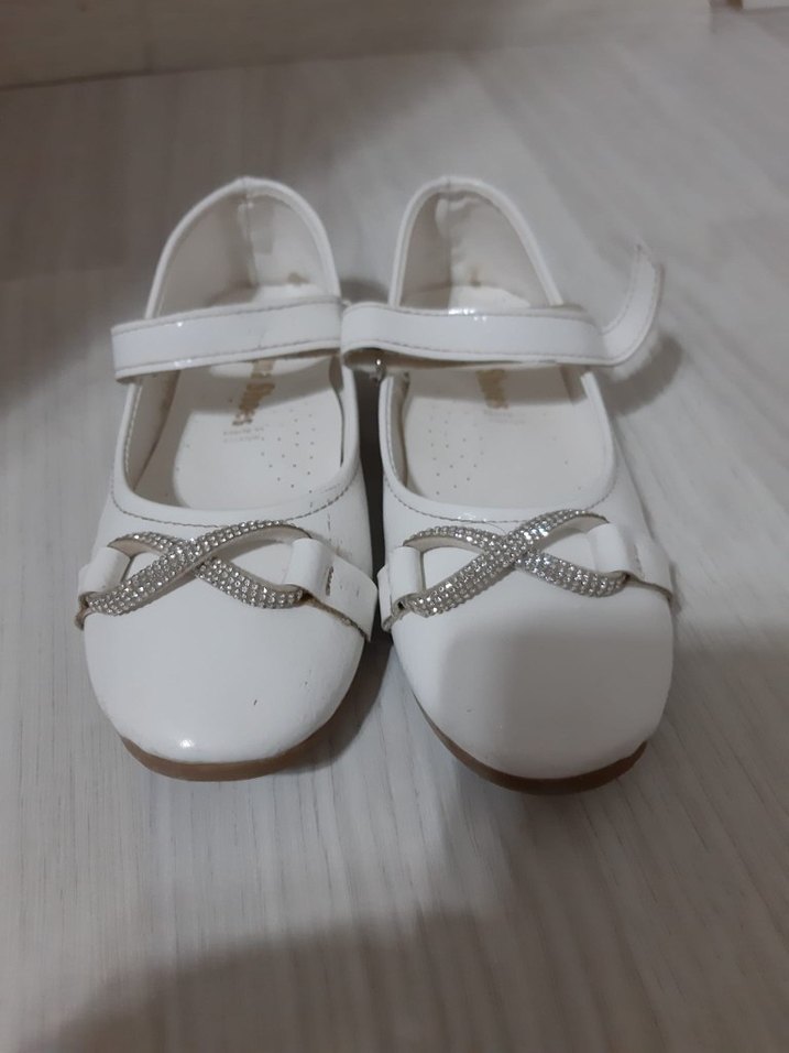 Beyaz parlak, tokalı kayışlı kız çocuk babetleri, ön kısmında zarif süslemeye sahip modern klasik tasarım. sadece küçük geldiği için satıyorum