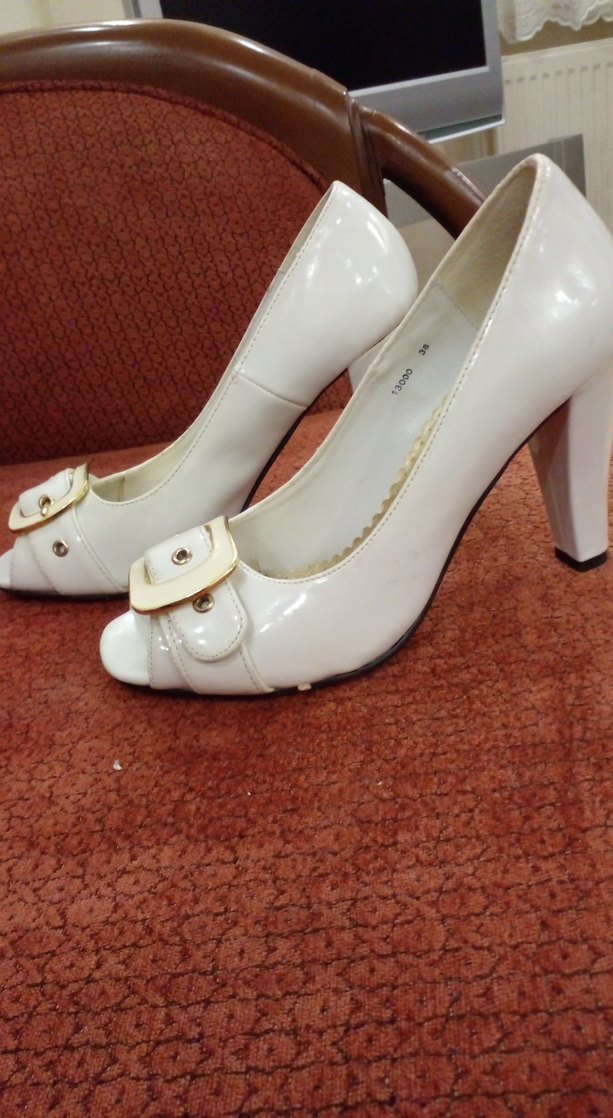 Beyaz parlak yüzeye sahip, tokalı ve yüksek topuklu stiletto, kauçuk malzemeden üretilmiştir, düğünler için uygundur.
