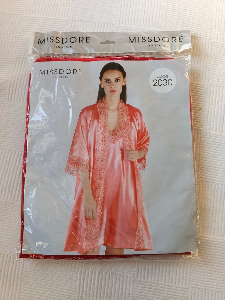 beyaz parlak uzun gece elbisesi, bol kesim ve kolsuz tasarımla, dantel detaylı uyumlu sabahlıkla tamamlanmıştır. Modern klasik tarzda rahat ve şık. Marka: MISSDORE, Kod: 2030.