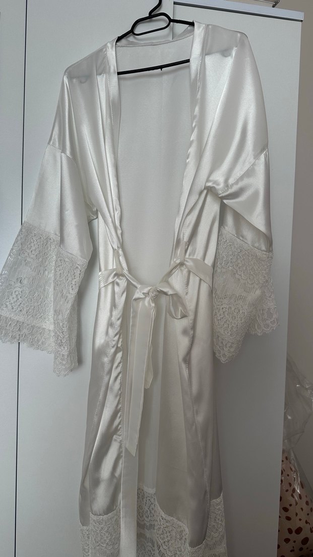 Beyaz parlak, uzun boy, bol kesim sabahlık; ince askılı kollar ve dantel detaylı geniş manşetlerle bohem Paris tarzını yansıtıyor. Ürün hiç kullanılmadı. Hem lohusa hem gelin sabahlığı için kullanabilirsiniz. Modeli mitaconsept modelinde uzun sabahlık/kimono.