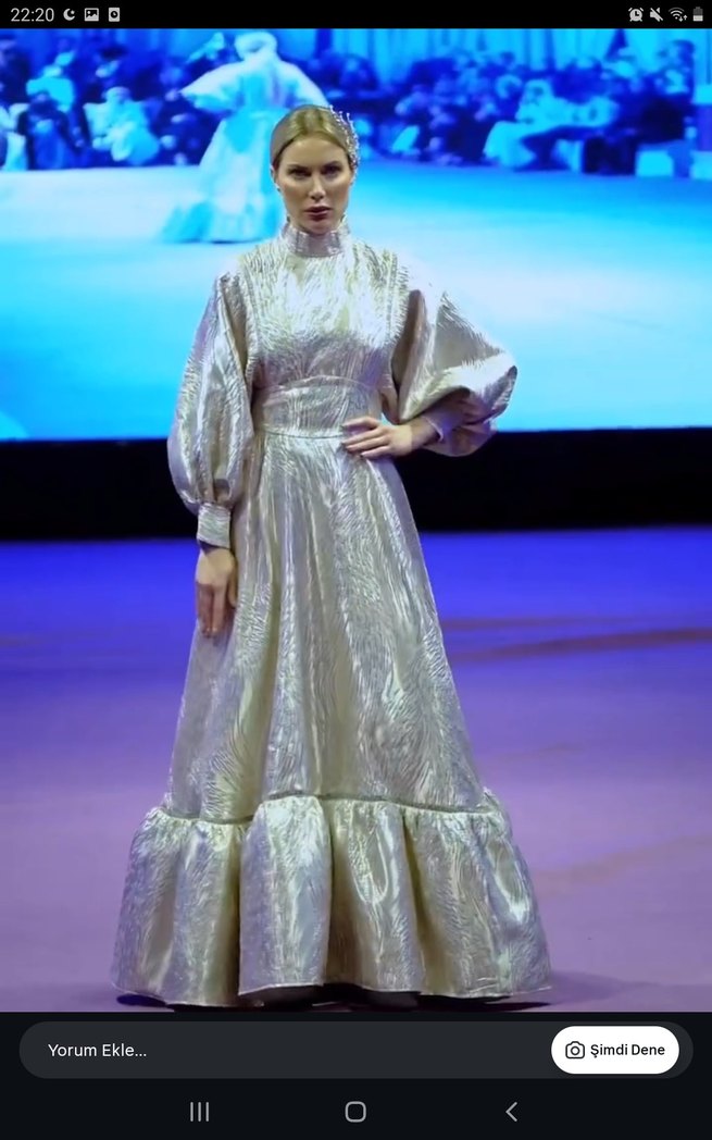 Parlak beyaz kumaştan, yüksek yakalı ve uzun kollu uzun elbise. Salaş kesimi ve drapeli detaylarıyla avant-garde düğünleri için uygun. ✨