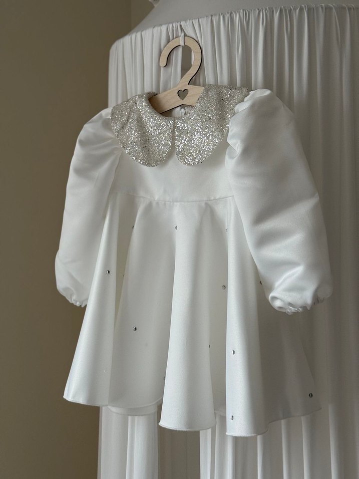 Beyaz parlak yakalı, fırfırlı ve işlemeli detaylara sahip kız elbisesi. İpeksi kumaştan, uzun kollu ve bol kesim, modern klasik tarzda.