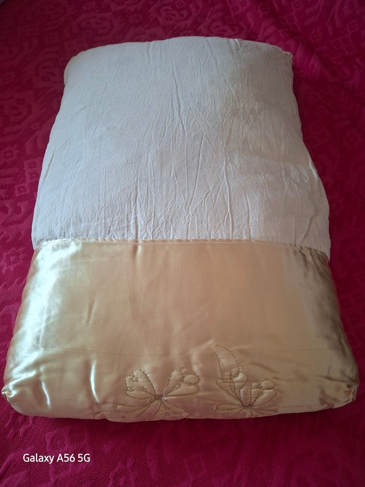 Beyaz renkte, bir ucunda ince çiçek işlemeli parlak kumaş bölümü bulunan yastık kılıfı. Düz ve yumuşak dokuludur. pamuktur.