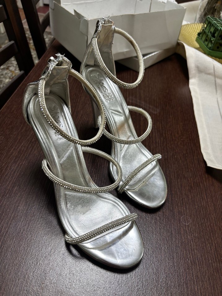 Beyaz parlak yılan desenli stiletto topuklu, metal tokalı kayışlara sahip, düğün ve özel anlar için uygun şık ayakkabı.